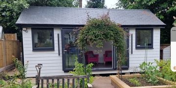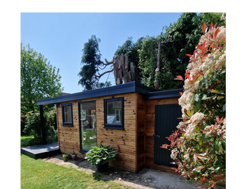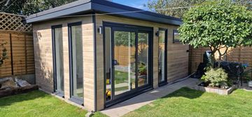 5.3m x 3.3m Stunning Garden Room with floor to ceiling windows and doors , "Natura" Durasid Premier Cladding , air conditioning, underfloor heating , concrete base. Fully remote via phone and exceptional insulation.