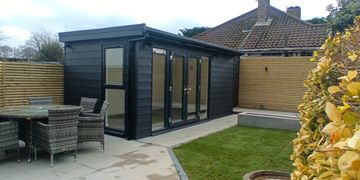 6m x 5m Luxury Garden Room with slate effect Britmet tiles , concrete textured cladding, skylights , uPVC doors and windows, air-conditioning , fully phone controlled lighting and heating , built in bar and kitchen.