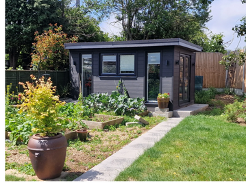 4m x 2.5m Beautiful Garden Room with matching storage shed. Superior quality interlocking composite cladding. Floor to ceiling windows and composite finished storage area. Phone controlled underfloor heating , internet ready and plastered internal finish